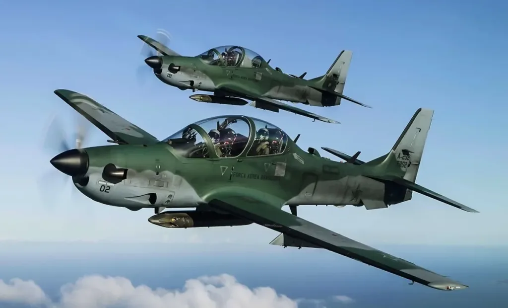 El A-29 Super Tucano es un avión biplaza turbohélice monomotor orientado al entrenamiento avanzado, el ataque a tierra y misiones de interdicción. Está equipado con un motor Pratt & Whitney Canada PT6A-68C de 1.600 caballos de fuerza, lo que le permite alcanzar una velocidad máxima cercana a los 590 km/h. Su alcance supera los 3.000 kilómetros con tanques externos, tiene un techo de servicio de más de 10.600 metros y puede transportar hasta 1.550 kilogramos de carga externa.