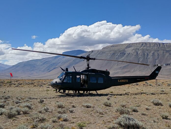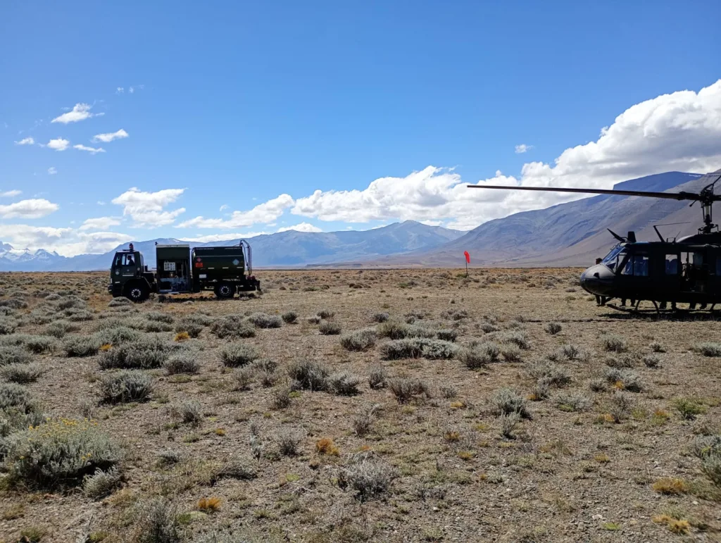 Allí, la Sección de Aviación 11 del Ejército Argentino está brindando apoyo logístico al combate aéreo, con un helicóptero Bell UH-1H y un camión cisterna VEE de 25 toneladas, y, además, colabora con el monitoreo del incendio.