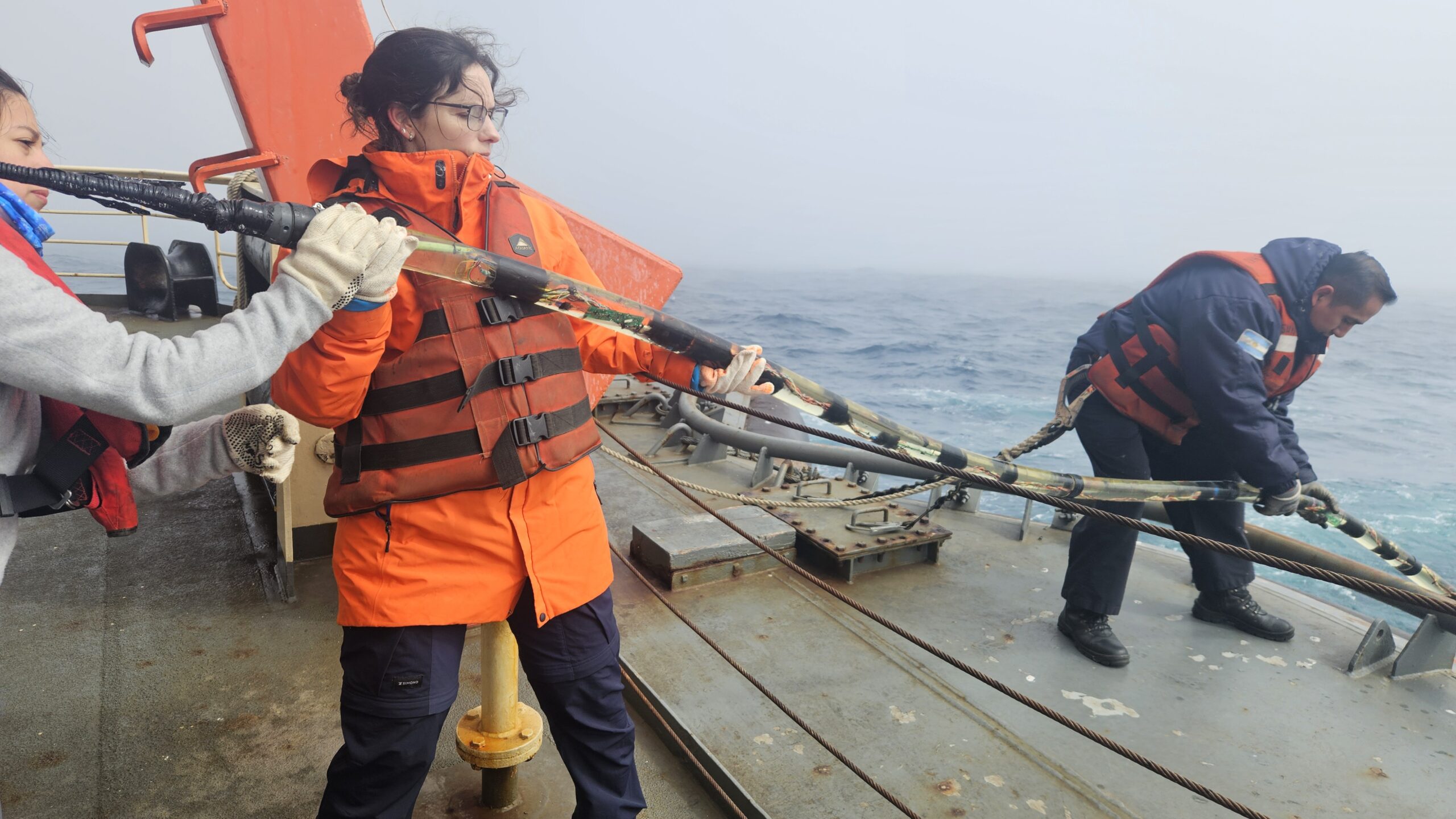 La tripulación es fundamental, ya que proporciona el espacio, las herramientas y el personal de apoyo necesarios. En particular, nuestro equipo trabaja estrechamente con el área de oceanografía del buque, que brinda asistencia diaria y ejecuta las maniobras técnicas, como el uso del guinche oceanográfico para desplegar el equipo.